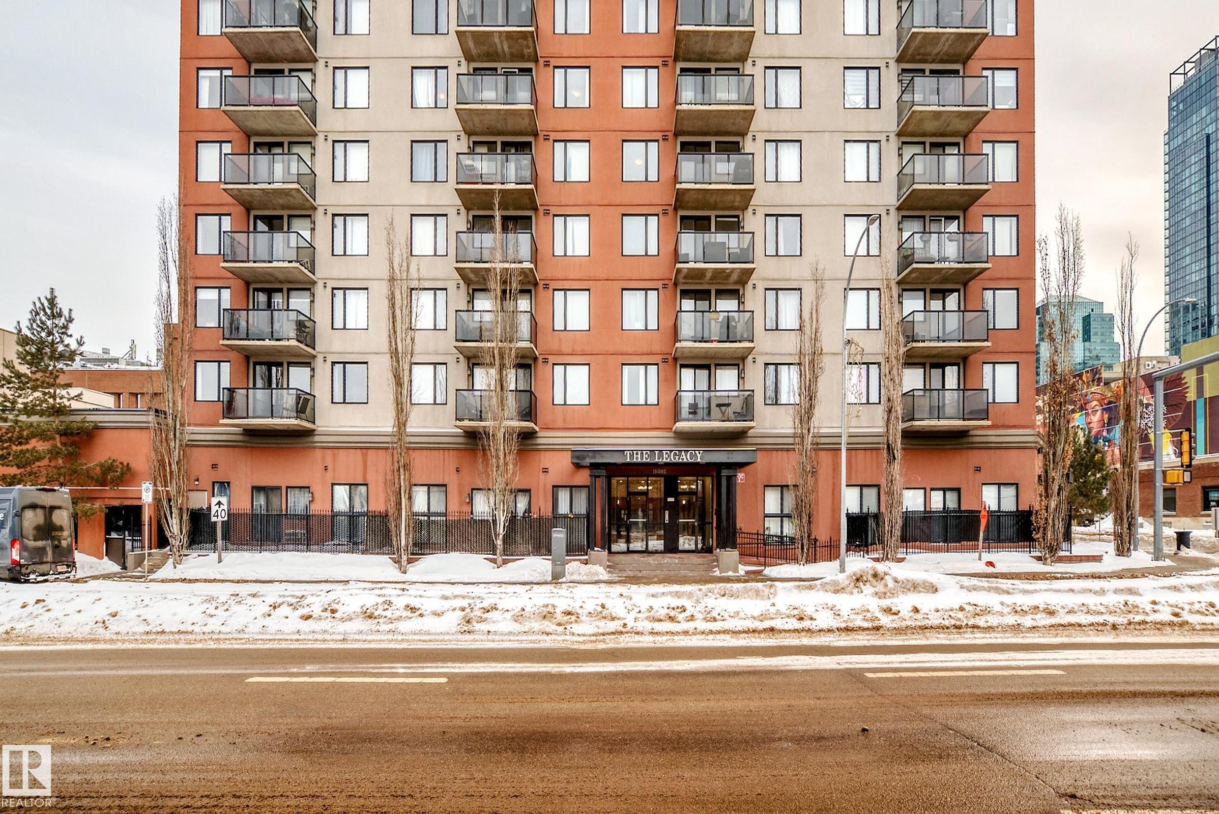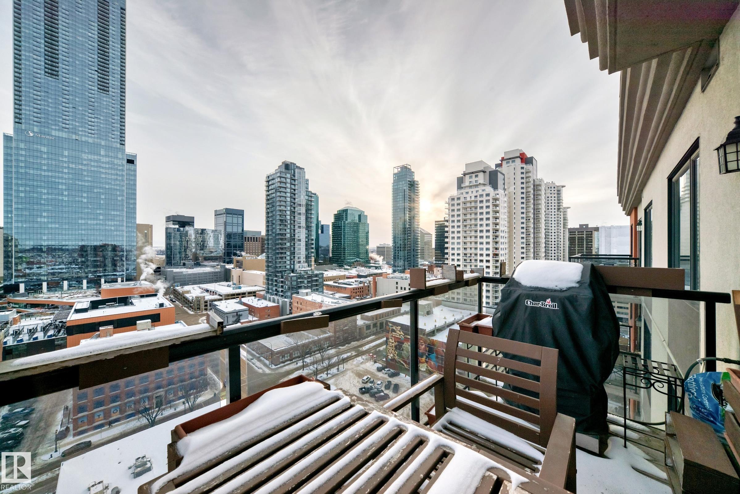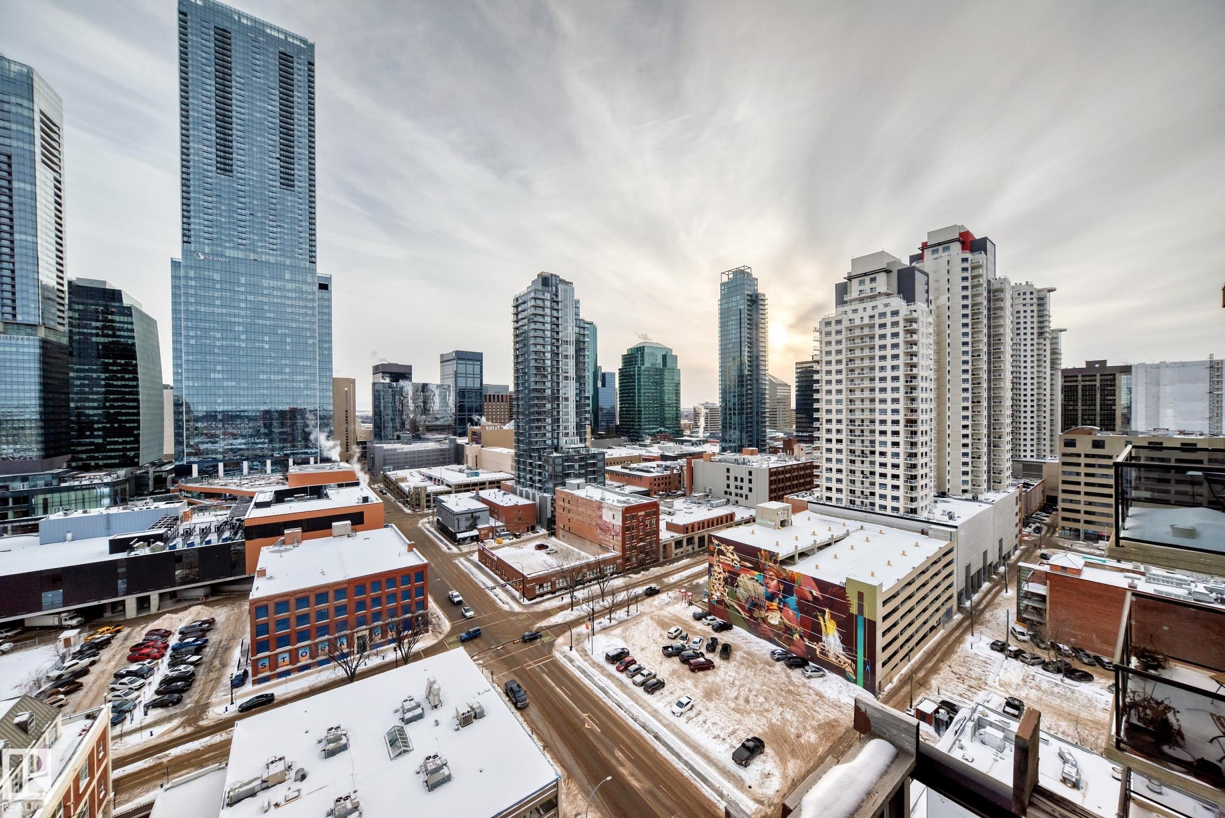 TOP FLOOR UNIT! PANORAMIC VIEW OF DOWNTOWN! CONCRETE BUILDING! TITLED UNDERGROUND PARKING! EXERCISE ROOM! SECURE BIKE STORAGE! WALKING DISTANCE TO ICE DISTRICT! TONS OF VISITOR PARKING! REASONABLE CONDO FEES INCLUDE HEAT & WATER. Stylish 1 bedroom condo located in the heart of Downtown in a sought after high rise. Offering an open layout w/expansive windows-perfect for living & entertaining! The bright contemporary kitchen has timeless white cabinetry & stainless appliances. Generous size master provides a peaceful retreat w/walk-thru closet to a luxurious 4pce bath. The spacious living room is anchored by a cozy fireplace & has patio doors to a private balcony. Additional features include convenient in-suite laundry, custom window coverings, hardwood floors & dedicated storage room. Enjoy close proximity to the river valley & trails, restaurants, coffee shops, shopping, LRT, UofA & MacEwan. This elevated urban condo combines modern design, abundant natural light & an unbeatable Downtown location!MOVE IN!