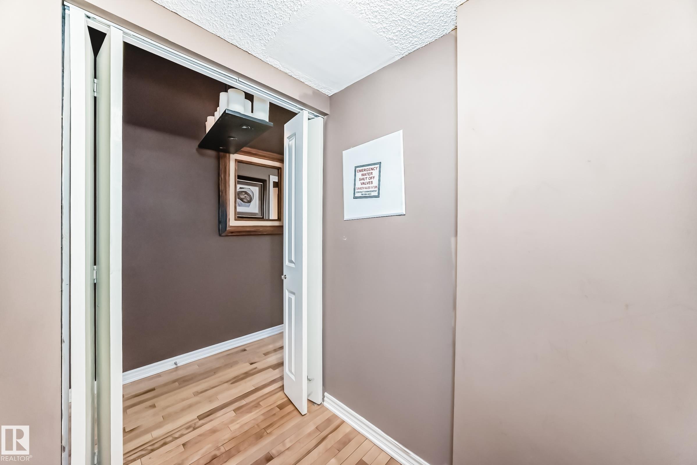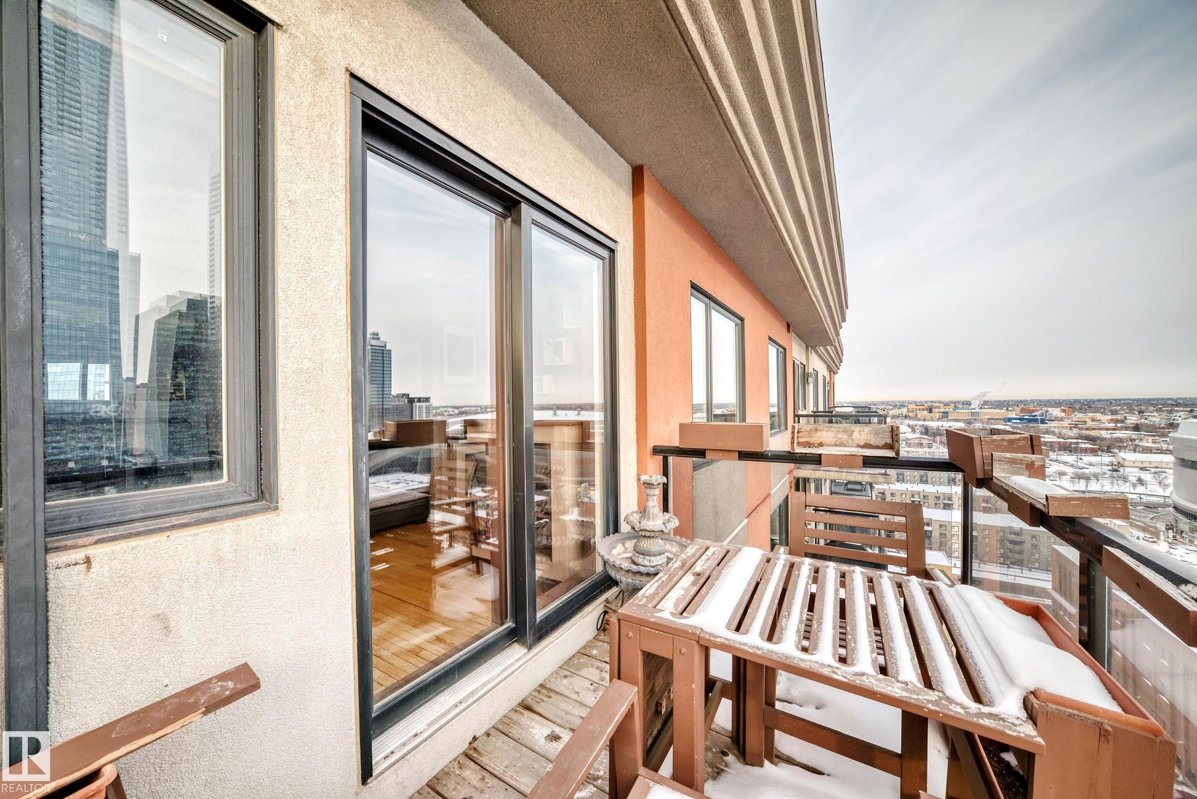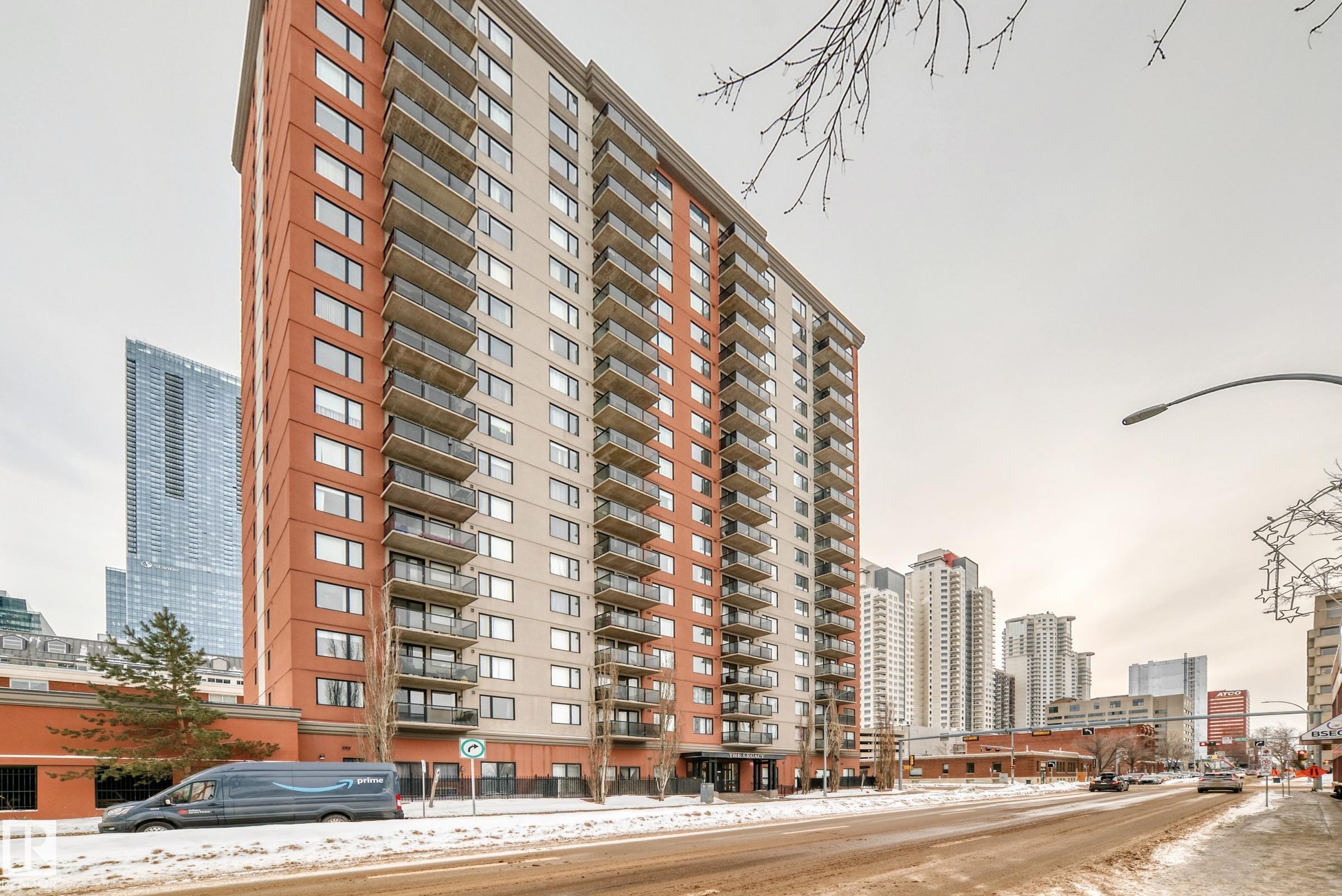 TOP FLOOR UNIT! PANORAMIC VIEW OF DOWNTOWN! CONCRETE BUILDING! TITLED UNDERGROUND PARKING! EXERCISE ROOM! SECURE BIKE STORAGE! WALKING DISTANCE TO ICE DISTRICT! TONS OF VISITOR PARKING! REASONABLE CONDO FEES INCLUDE HEAT & WATER. Stylish 1 bedroom condo located in the heart of Downtown in a sought after high rise. Offering an open layout w/expansive windows-perfect for living & entertaining! The bright contemporary kitchen has timeless white cabinetry & stainless appliances. Generous size master provides a peaceful retreat w/walk-thru closet to a luxurious 4pce bath. The spacious living room is anchored by a cozy fireplace & has patio doors to a private balcony. Additional features include convenient in-suite laundry, custom window coverings, hardwood floors & dedicated storage room. Enjoy close proximity to the river valley & trails, restaurants, coffee shops, shopping, LRT, UofA & MacEwan. This elevated urban condo combines modern design, abundant natural light & an unbeatable Downtown location!MOVE IN!