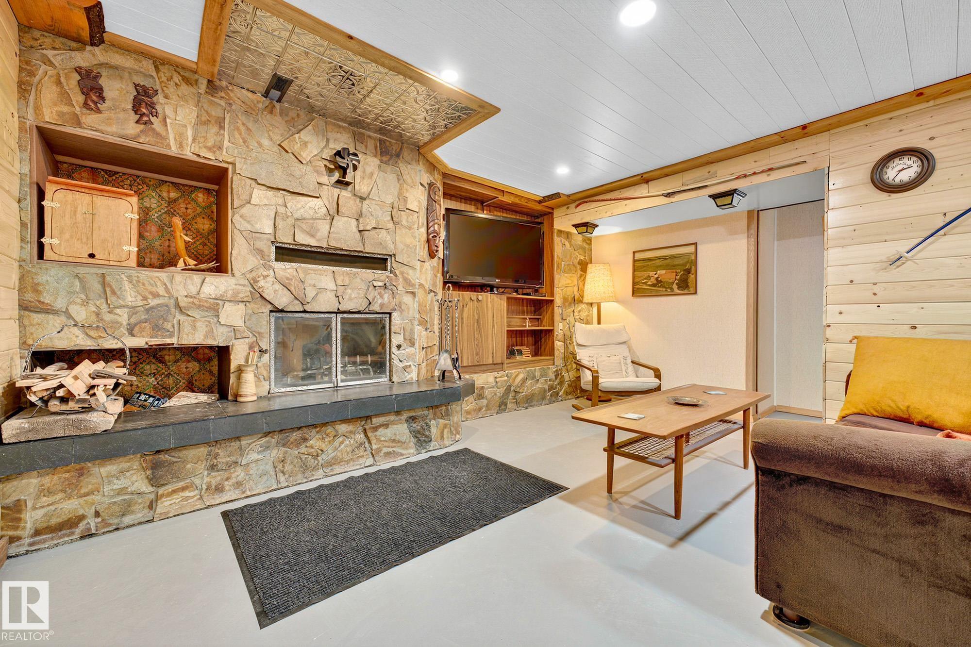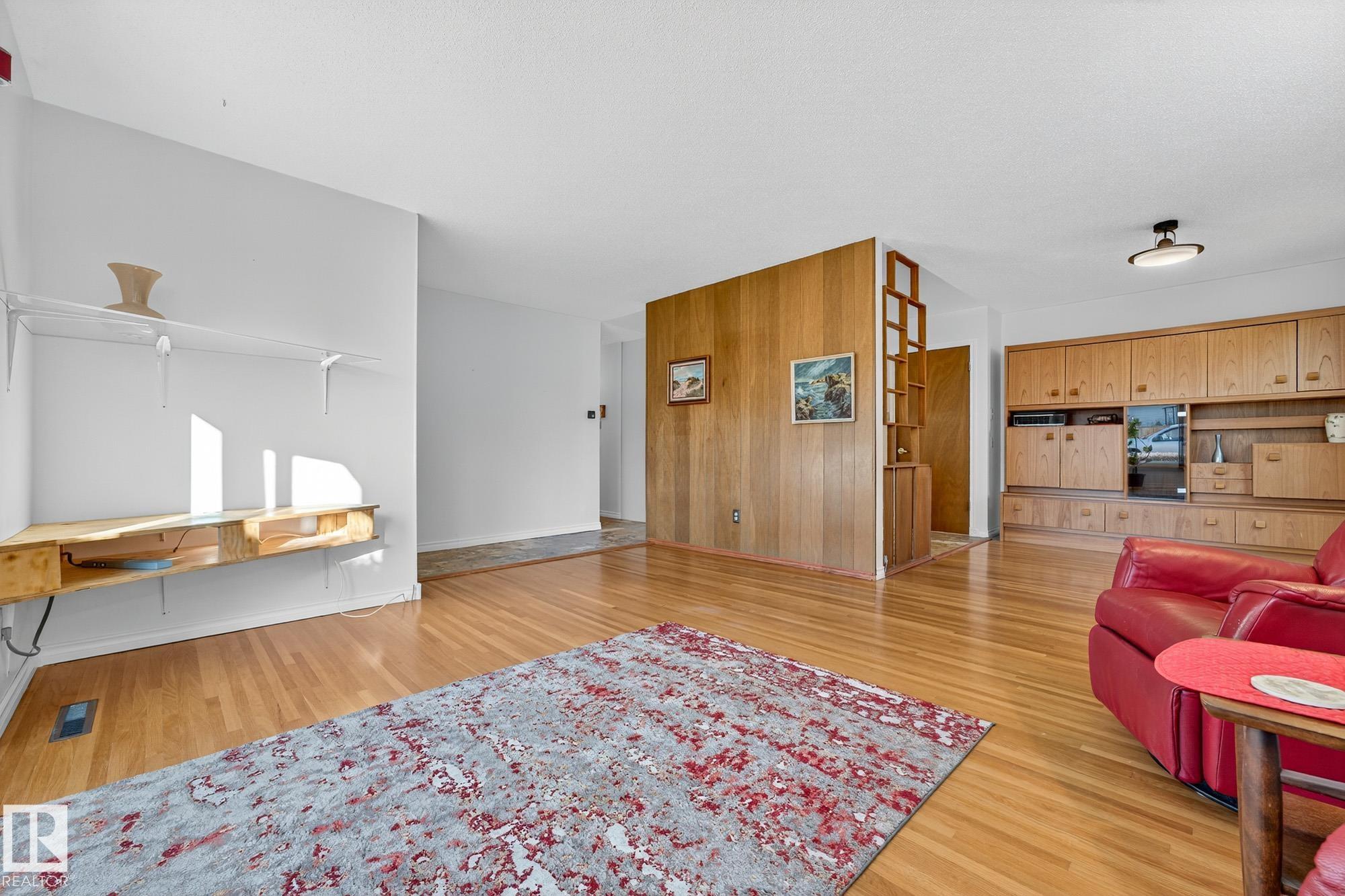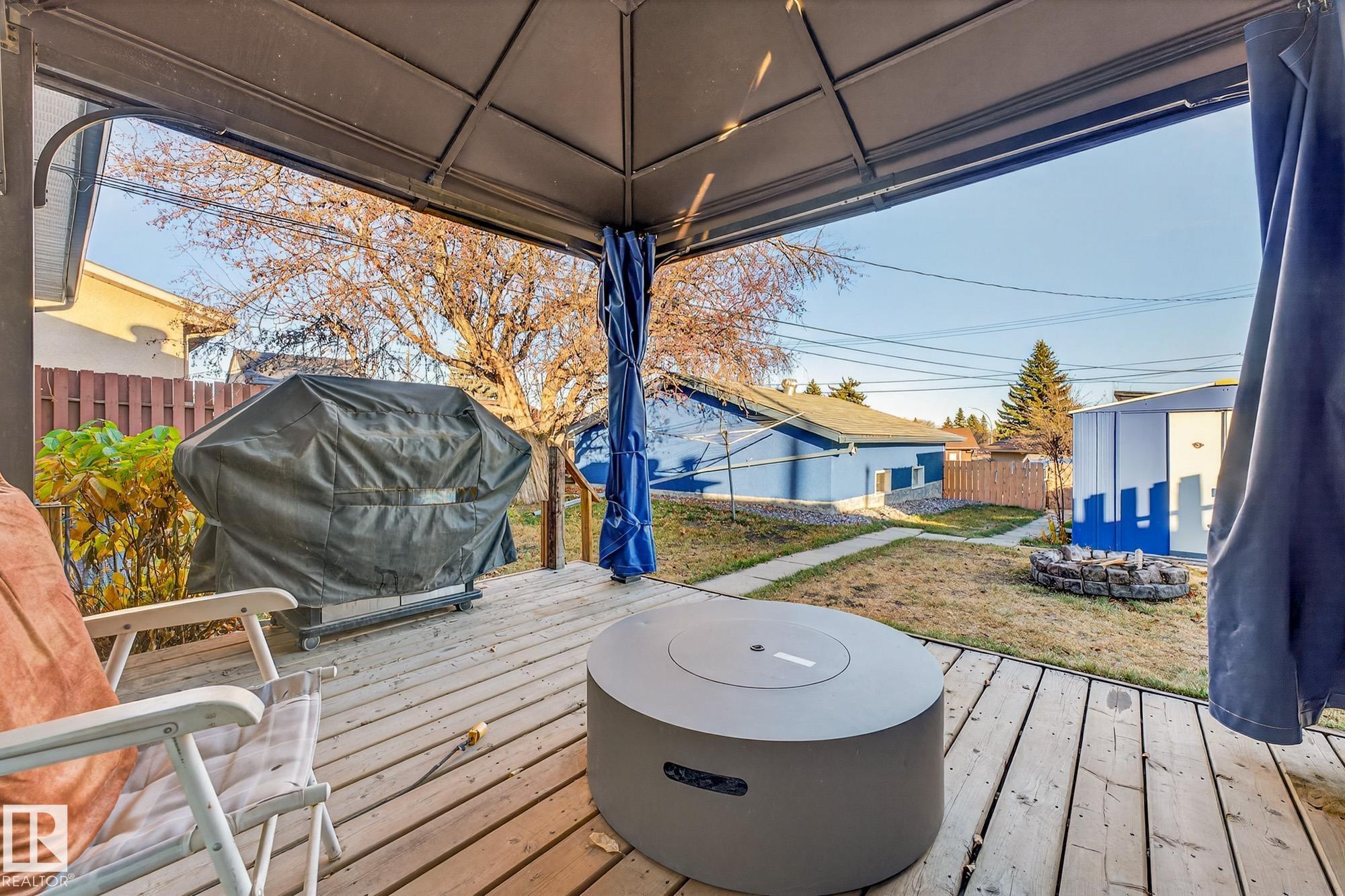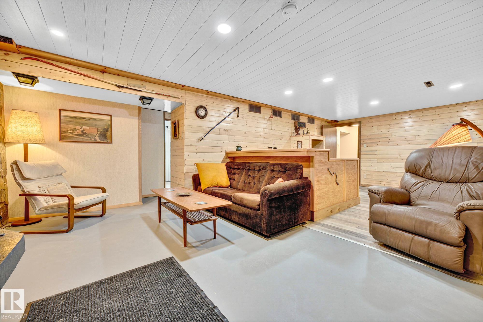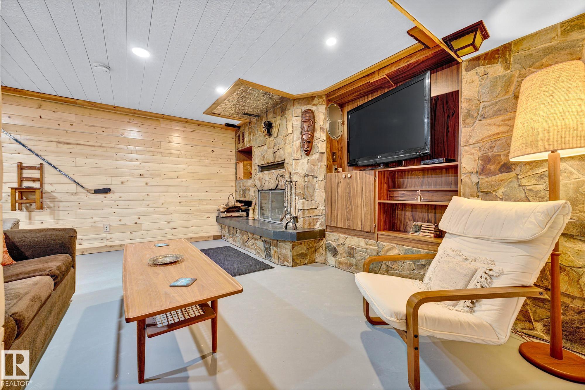 Nestled just off Ada Boulevard and steps from Rundle Park, this bungalow tells a story of warmth and belonging. Morning light filters through triple-pane Pella windows, catching the texture of hardwood floors and mid-century details that speak to another era of craftsmanship. The living and dining spaces flow effortlessly, creating room for conversation and quiet moments alike, while the bright kitchen overlooks the backyard, a view of changing seasons framed by trees and sky. Three main-floor bedrooms offer comfort and calm, and downstairs, a pine-paneled rec room with a wood-burning fireplace and wet bar sets the stage for gatherings that linger into the night. Two additional bedrooms, a full bath, and generous storage complete the home's thoughtful layout. Outside, a pergola-topped deck and oversized heated double garage extend both function and charm. In a community defined by river trails, parks, and connection, this is a haven where every season feels like home.