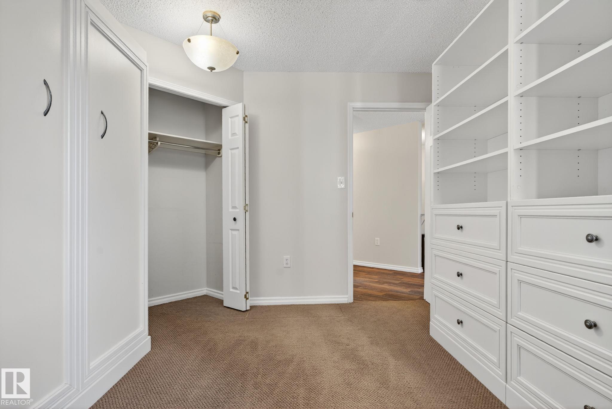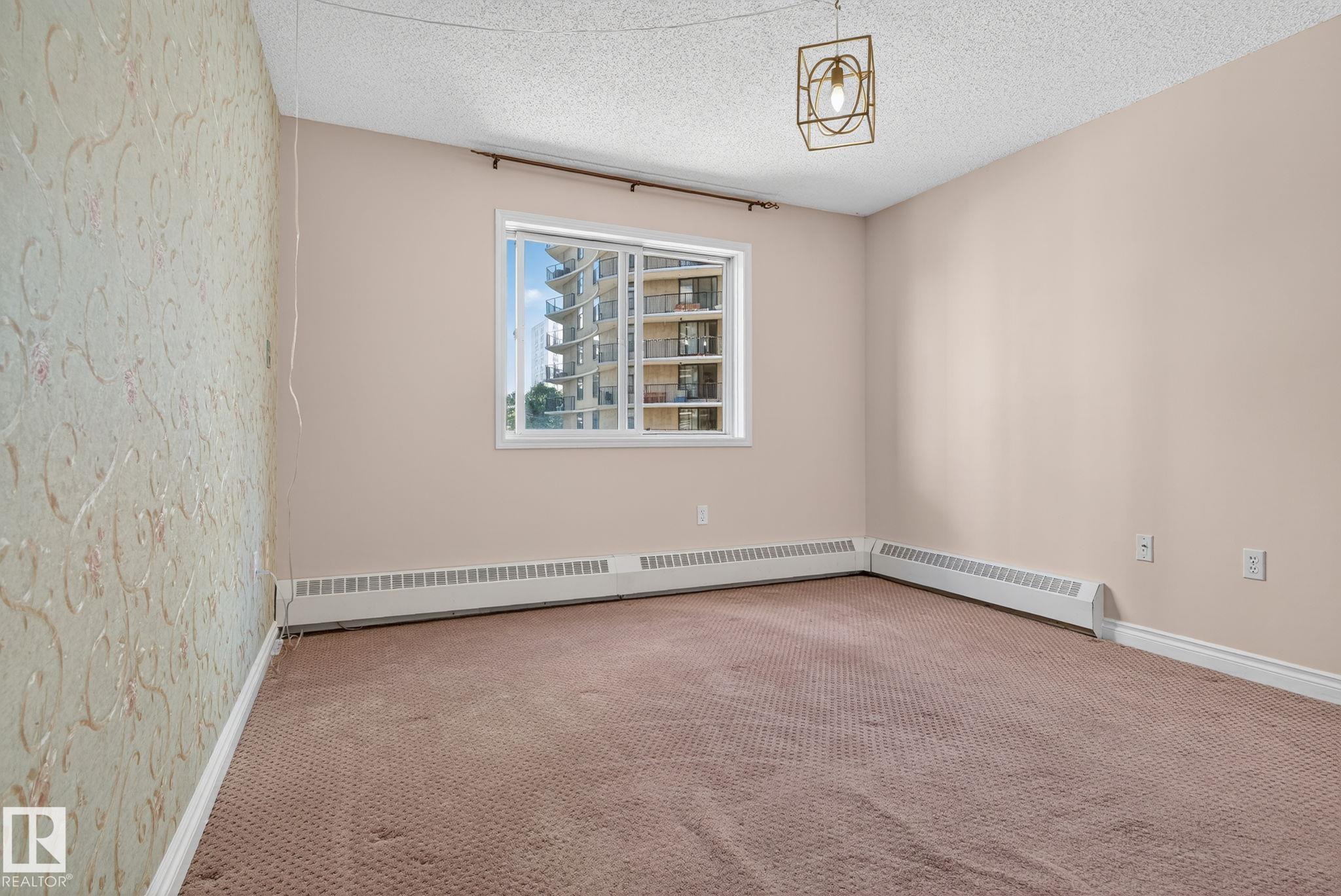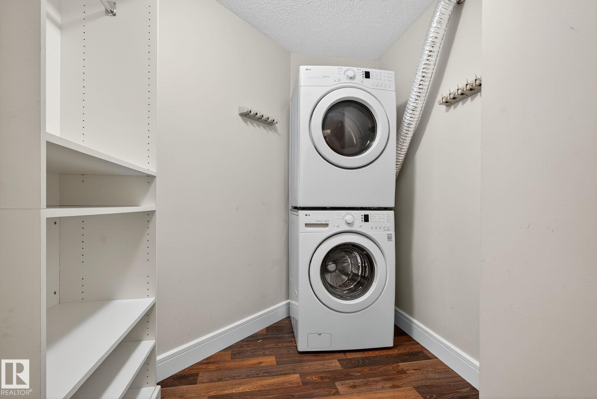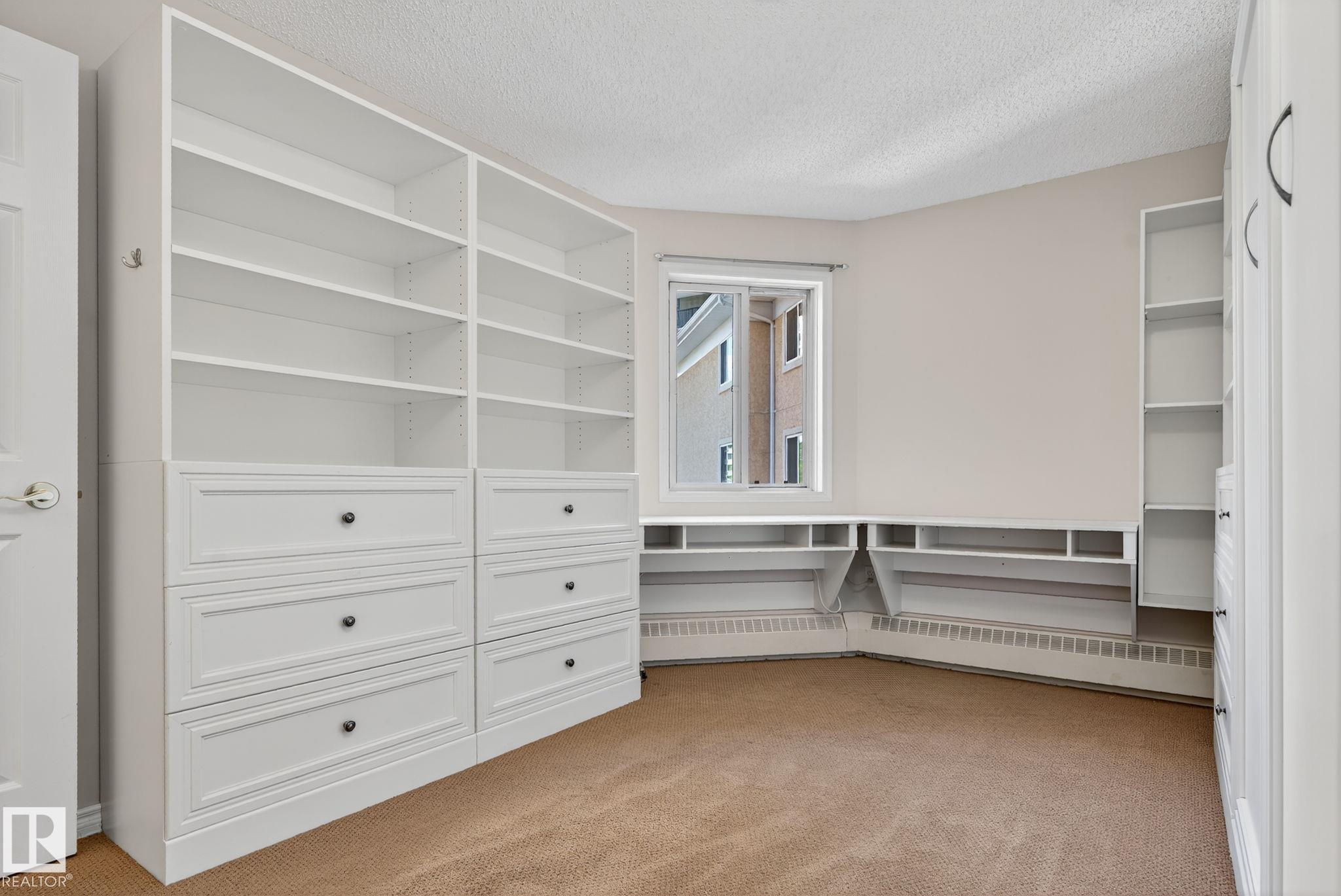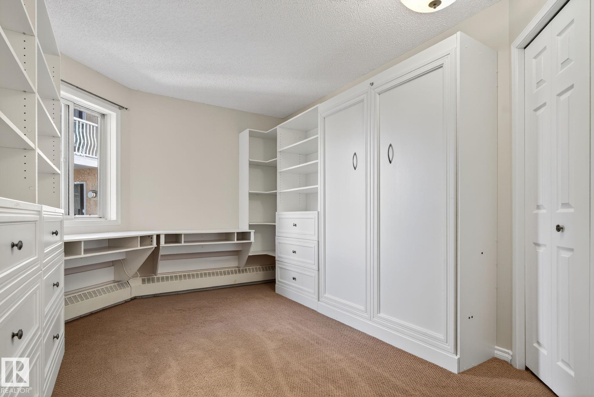 Executive 2-bedroom, 2-bath condo in prestigious Victoria Promenade, steps to the River Valley, golf, and scenic trails. Walk to Jasper Ave, 124 Street, shopping, Brewery District, Ice District, and close to transit and universities. Overlooking Victoria Park, this updated home features fresh paint, new flooring in kitchen, laundry, and baths, new vanity, and modern fixtures. Spacious entry opens to a kitchen with white cabinets, pantry, and eating bar, flowing into living/dining and a covered balcony with BBQ gas hookup. Primary suite offers walk-in closet and 4-piece ensuite. Second bedroom includes Murphy bed, custom cabinetry, and built-in desk--ideal for guests, office, or hobbies--next to a 3-piece bath. In-suite laundry with storage, titled underground stall (#99), and storage locker included. Pet-friendly, well-run building with social room and visitor parking.