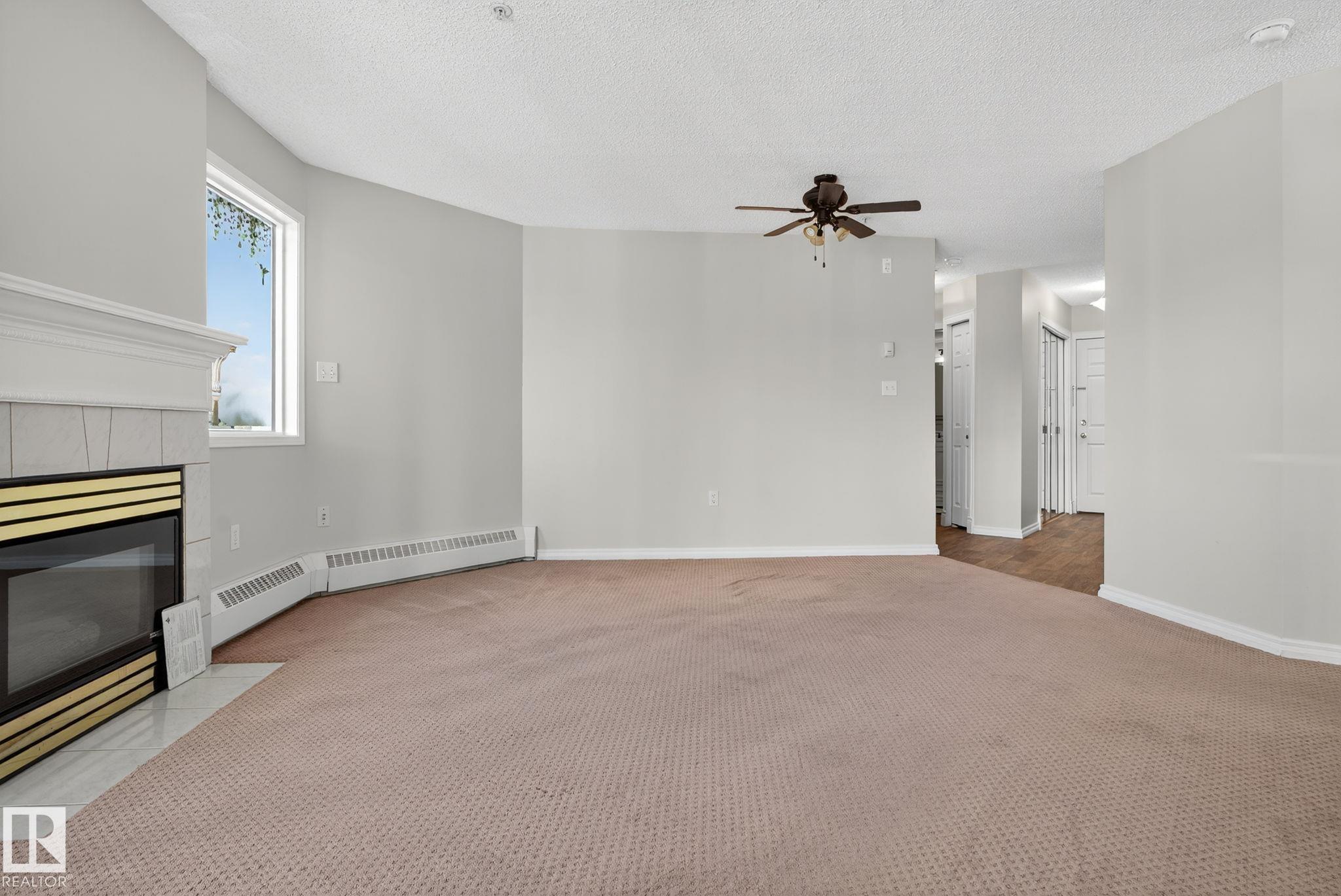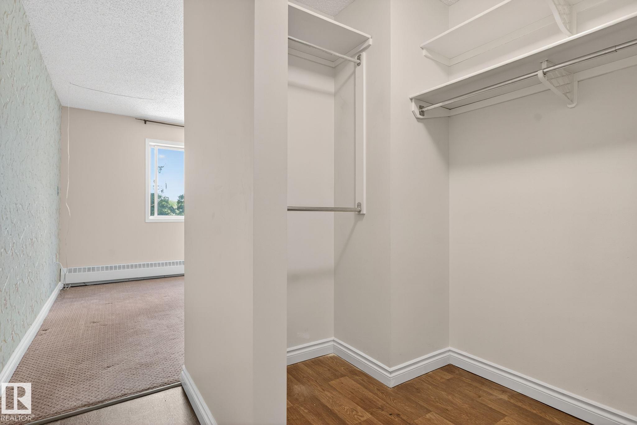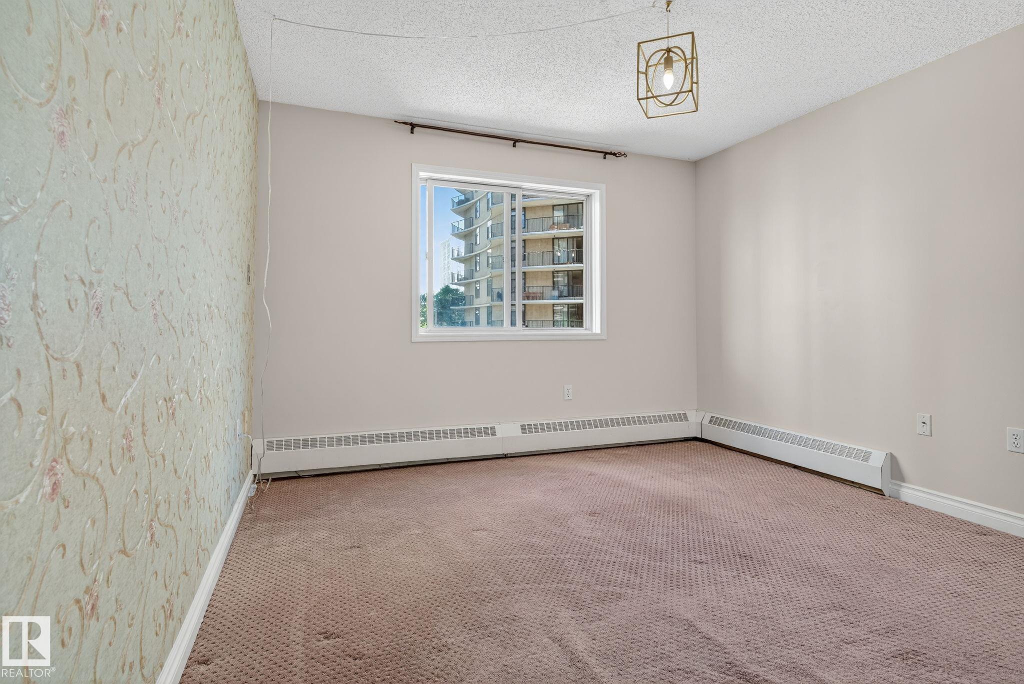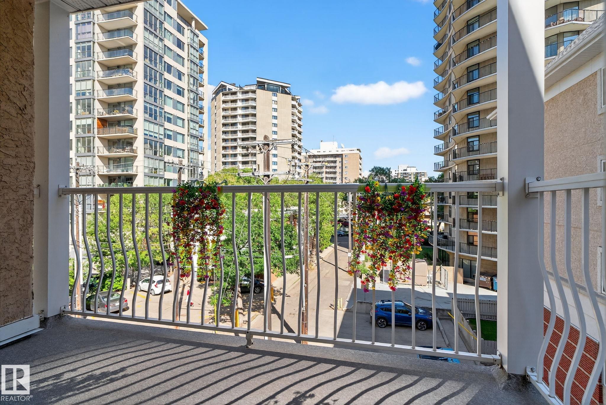Executive 2-bedroom, 2-bath condo in prestigious Victoria Promenade, steps to the River Valley, golf, and scenic trails. Walk to Jasper Ave, 124 Street, shopping, Brewery District, Ice District, and close to transit and universities. Overlooking Victoria Park, this updated home features fresh paint, new flooring in kitchen, laundry, and baths, new vanity, and modern fixtures. Spacious entry opens to a kitchen with white cabinets, pantry, and eating bar, flowing into living/dining and a covered balcony with BBQ gas hookup. Primary suite offers walk-in closet and 4-piece ensuite. Second bedroom includes Murphy bed, custom cabinetry, and built-in desk--ideal for guests, office, or hobbies--next to a 3-piece bath. In-suite laundry with storage, titled underground stall (#99), and storage locker included. Pet-friendly, well-run building with social room and visitor parking.