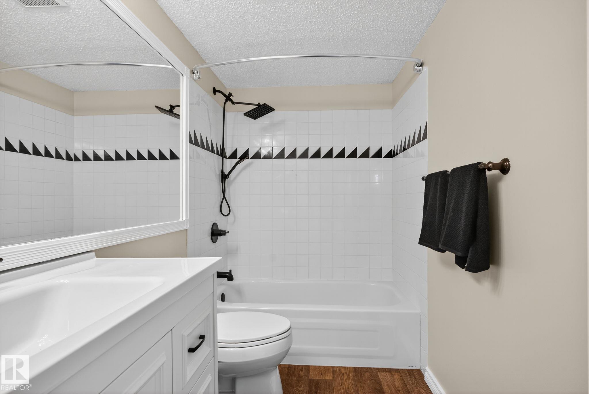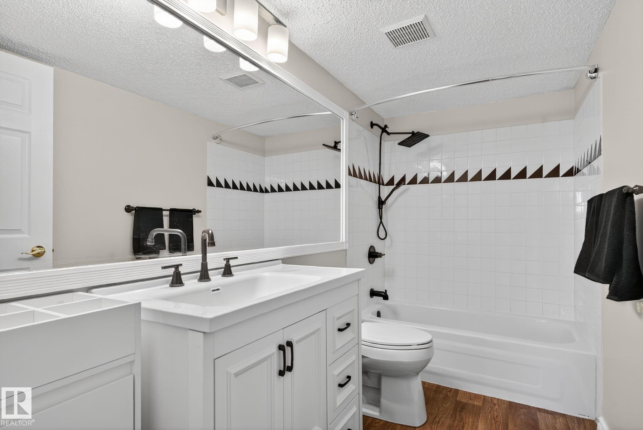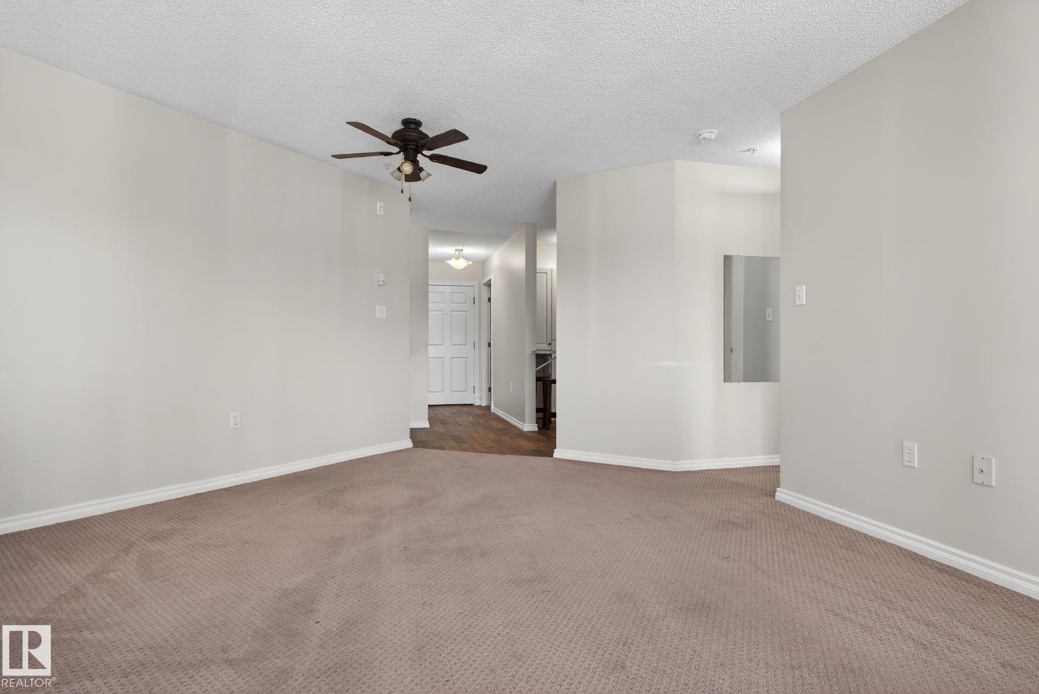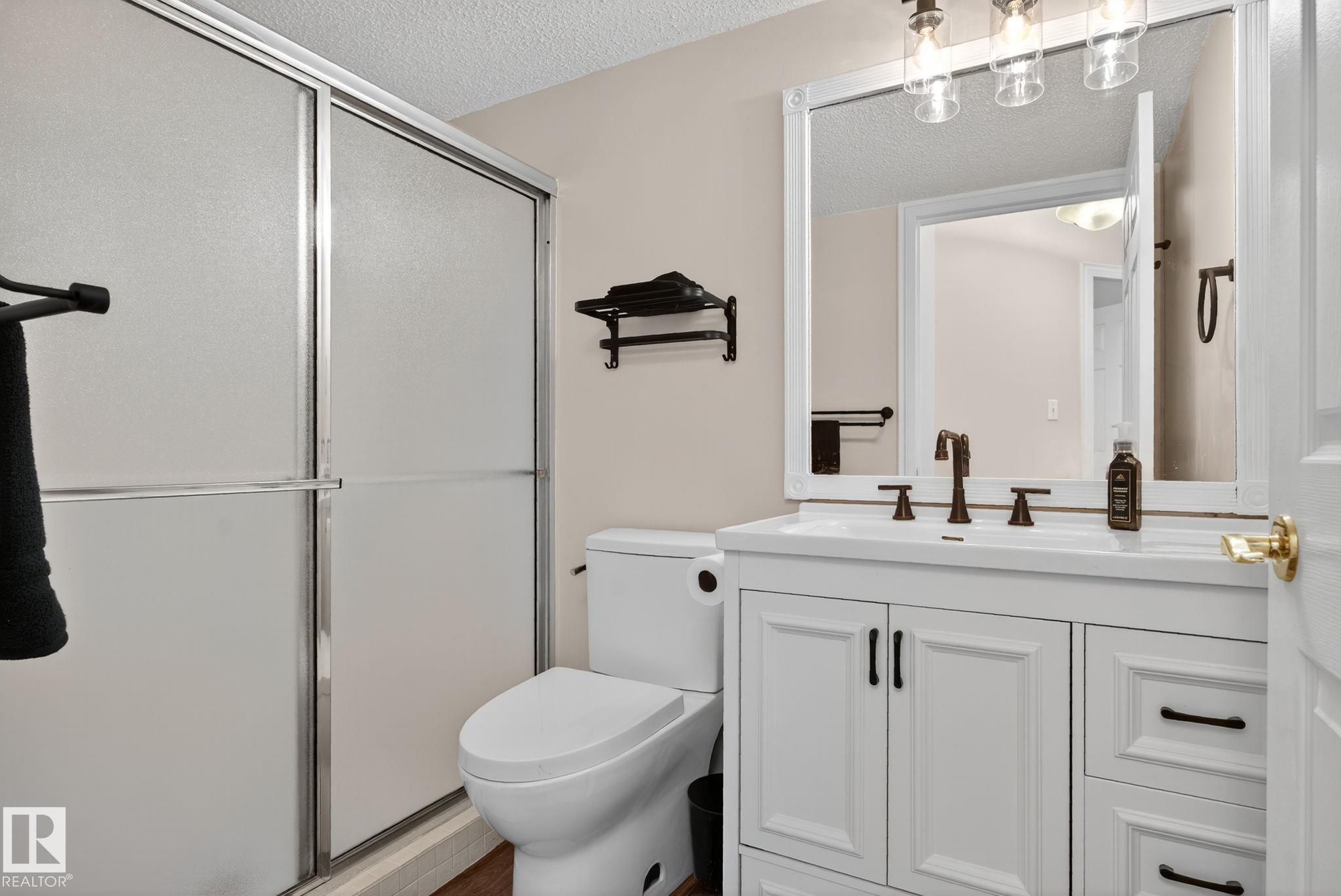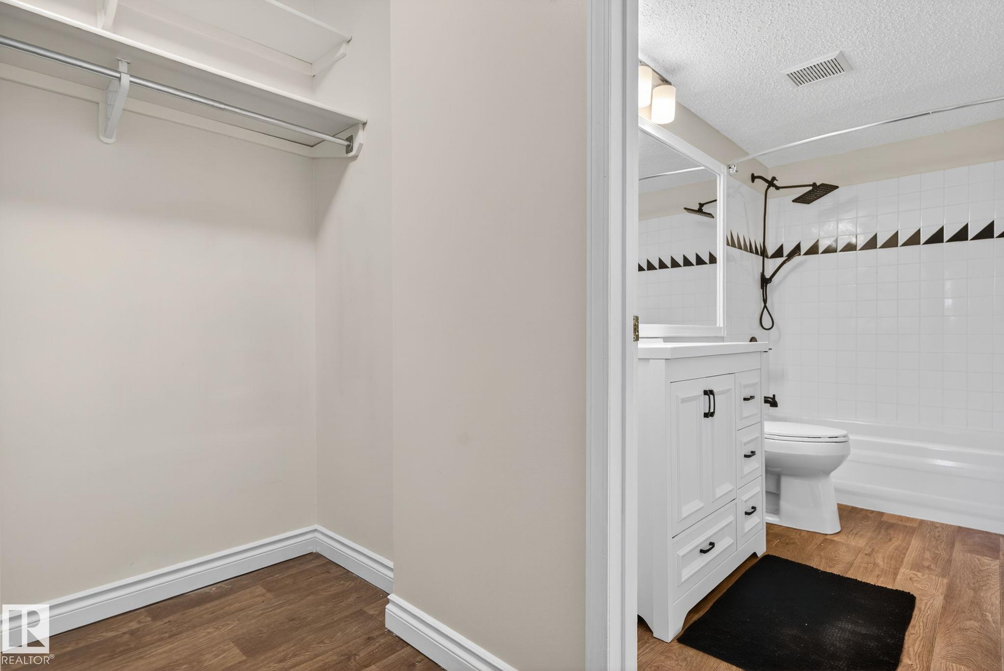 Executive 2-bedroom, 2-bath condo in prestigious Victoria Promenade, steps to the River Valley, golf, and scenic trails. Walk to Jasper Ave, 124 Street, shopping, Brewery District, Ice District, and close to transit and universities. Overlooking Victoria Park, this updated home features fresh paint, new flooring in kitchen, laundry, and baths, new vanity, and modern fixtures. Spacious entry opens to a kitchen with white cabinets, pantry, and eating bar, flowing into living/dining and a covered balcony with BBQ gas hookup. Primary suite offers walk-in closet and 4-piece ensuite. Second bedroom includes Murphy bed, custom cabinetry, and built-in desk--ideal for guests, office, or hobbies--next to a 3-piece bath. In-suite laundry with storage, titled underground stall (#99), and storage locker included. Pet-friendly, well-run building with social room and visitor parking.