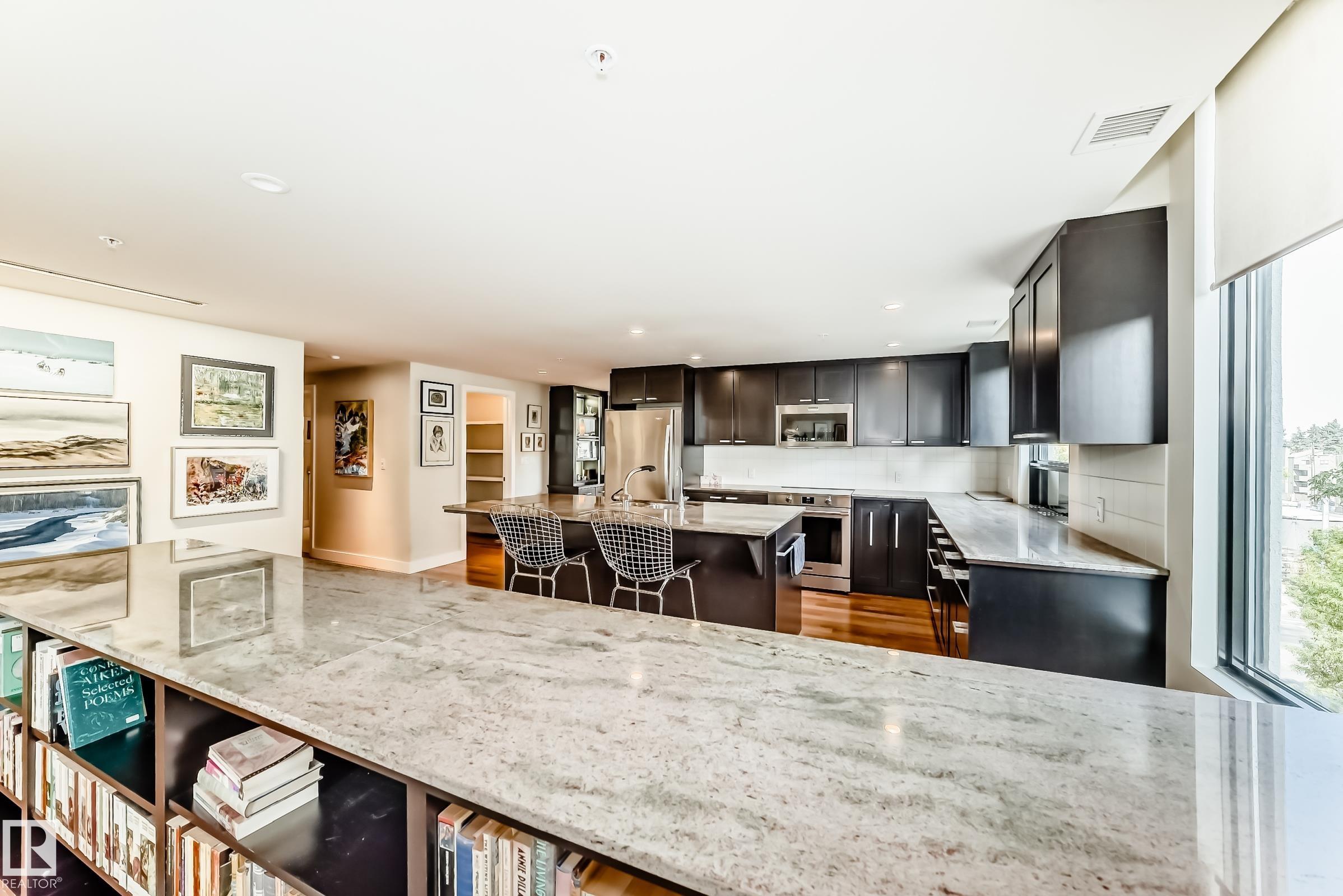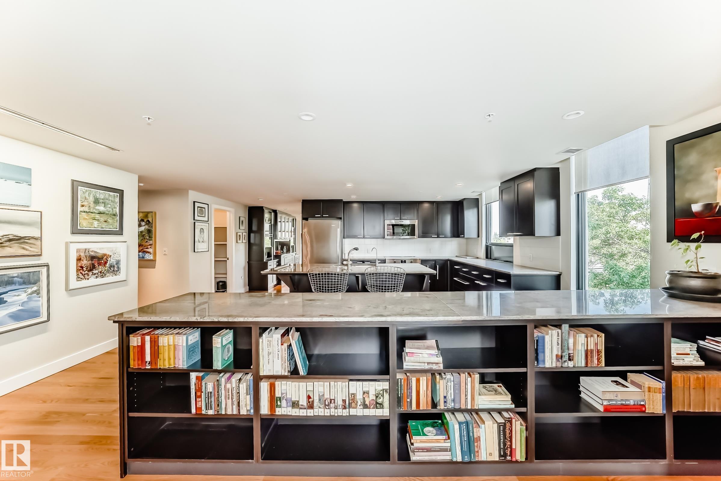 Amazing size 2,749 sq ft of elegance, wine cellar, office, Dream Chef +++ Kitchen for the body and soul unlike any other! Wraparound mature tree views from wall size windows in living and dining rooms-- high celings complemented by two balconies--this serene retreat must be seen to appreciate its timeless elegance. Extensive custom cabinetry is perfect for your cherished possessions. The showcase kitchen with endless counters and cabinets plus a temperature controlled wine cellar is perfect for entertaining and opens to a cozy family room with fireplace. A window-wrapped den lined with bookshelves creates the perfect retreat, while the breathtaking primary suite with wall-to-wall custom cabinetry is an oasis of calm. With two additional bedrooms (one currently a library), a serious amount of in-suite storage space, two titled parking stalls, exceptional downtown walkability to all amenities and the river valley steps away, this home perfectly fits the effortless living urban lifestyle you are looking for.